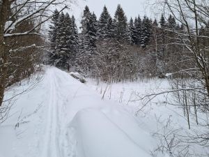 Поврежденную часть лыжни по-прежнему оставляет желать много лучшего: лыжня местами вихляет в стороны и имеет уклон, также появилась пара новых упавших деревьев поперек узкоколейки. В целом маршрут пригоден для прохождения. Соблюдайте осторожность при проходе через мост. |