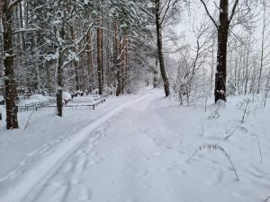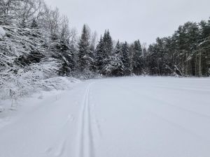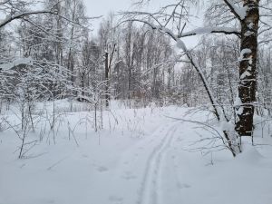 Лыжня в неудовлетворительном состоянии: плохо видна, заледенела, местами истоптана, в лесу ветки-шишки-иголки.