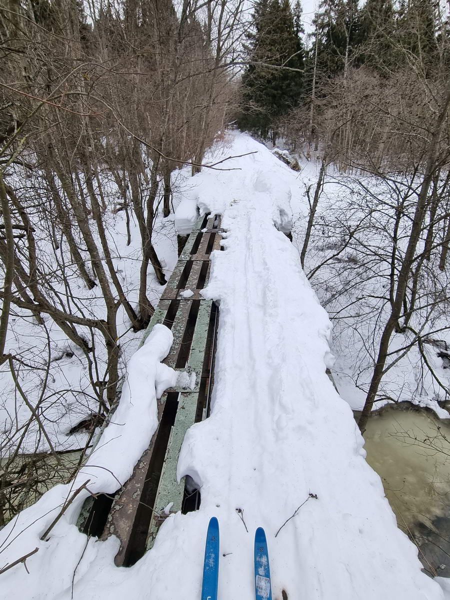 Лыжня находится во вполне приемлемом состоянии с учетом погодных условий конца зимы. Сегодня снег твердый, не проваливается, позволяет двигаться вне лыжни на проблемных участках. В целях безопасности Чёртов мост лучше переходить с лыжами в руках, а не на ногах.